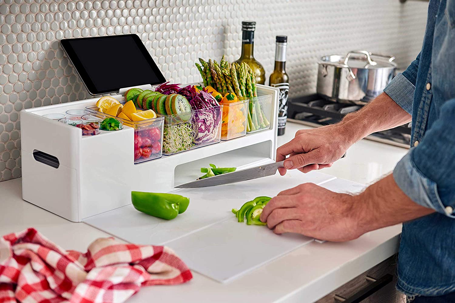 Home » General » Cutting Board with Prep Containers General Cutting Board with Prep Containers March 22, 2020 109 Keep your kitchen tidy, organized & accessible with 45 plus unique feature Prepdeck meal prep station! Inspired by “mise en place” technique, it keeps everything functional to prepare meals between 2 to 5 people and keep leftovers fresh in the fridge afterward.Prepdeck kitchen Storage organizer/kitchen utensil organizer uses durable Tritan plastic that doesn’t fade scratch, shatter or fade in color. All other multi-utility utensils are BPA and EA free, antibacterial, food-safe and top-rack dishwasher safe free of any harmful toxins.Prepdeck cutting board offers a generous 1.7′ 2″ (0.15m) of cutting surface & doubles as a sleek, detachable, interchangeable enclosure to your Prepdeck. Magnetically connected, it’s easy to detach so you can change out your cutting board to match your kitchen or personal style! Handles any knife type, slice/dice all ingredients, meats, & vegetables.The kitchen storage organizer comes with a flexible cutting board (21.4″ L x 6.2″ W x 6.2″ H); 15 bpa free meal prep containers – 5 large, 2 medium, 2 small, 6 mini with measurement markings in ounces, cups, & milliliters; Removable 13” trash bin & utensil storage. Multiuse prepping tools: Grater, Zester, Juicer, Slicer, Garlic Grater, Vegetable Peeler, Julienne, Green Stripper, Bottle Opener.