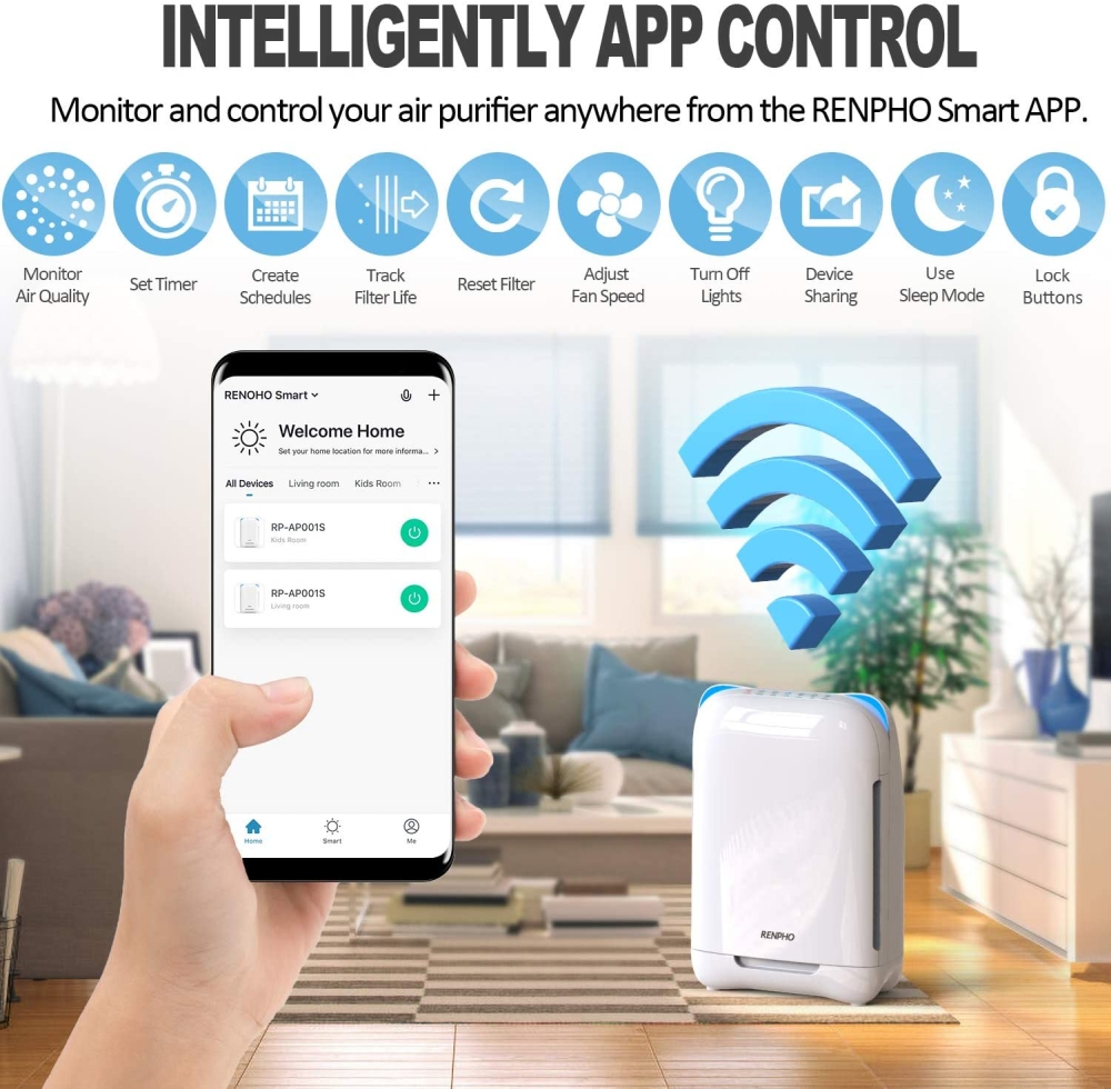 Home » Gadgets » Air Purifier True HEPA Filter for Large Room 301 SQ.FT with Smart WiFi Gadgets Air Purifier True HEPA Filter for Large Room 301 SQ.FT with Smart WiFi April 1, 2020 82 Remote Control: Monitor and control your home air purifier anywhere from the RENPHO Smart App; Compatible with Alexa, Google Assistant, voice control to turn on/off your air purifier. 5 Stage filtration system effectively eliminates 99.97% airborne pollutants in rooms up to 301 sq.ft (28 m²) 3 times per hour; CADR Rated 135 CFM (230m³/h).Smart Auto Quality Sensor: With a built-in smart air quality sensor, the air purifier can detect air quality at every moment, automatically change colors and adjust fan speeds based on the air quality it senses.Whisper-Quiet Operation: Sleep mode is awesome for the bedroom with a noise level at 35dB. Create a schedule and timer on APP to automatically change the mode to conserve energy. Child lock mode makes it can be locked so that not affected by the curious cat, or any children.Separated Filter Replacement Indicator: Replace the single filter when the appropriate filter indicator light starts to flash, not need to replace all filters together as one piece, which helps to save your money. The filter set is available for purchase (Search for RP-AP001 Filter).