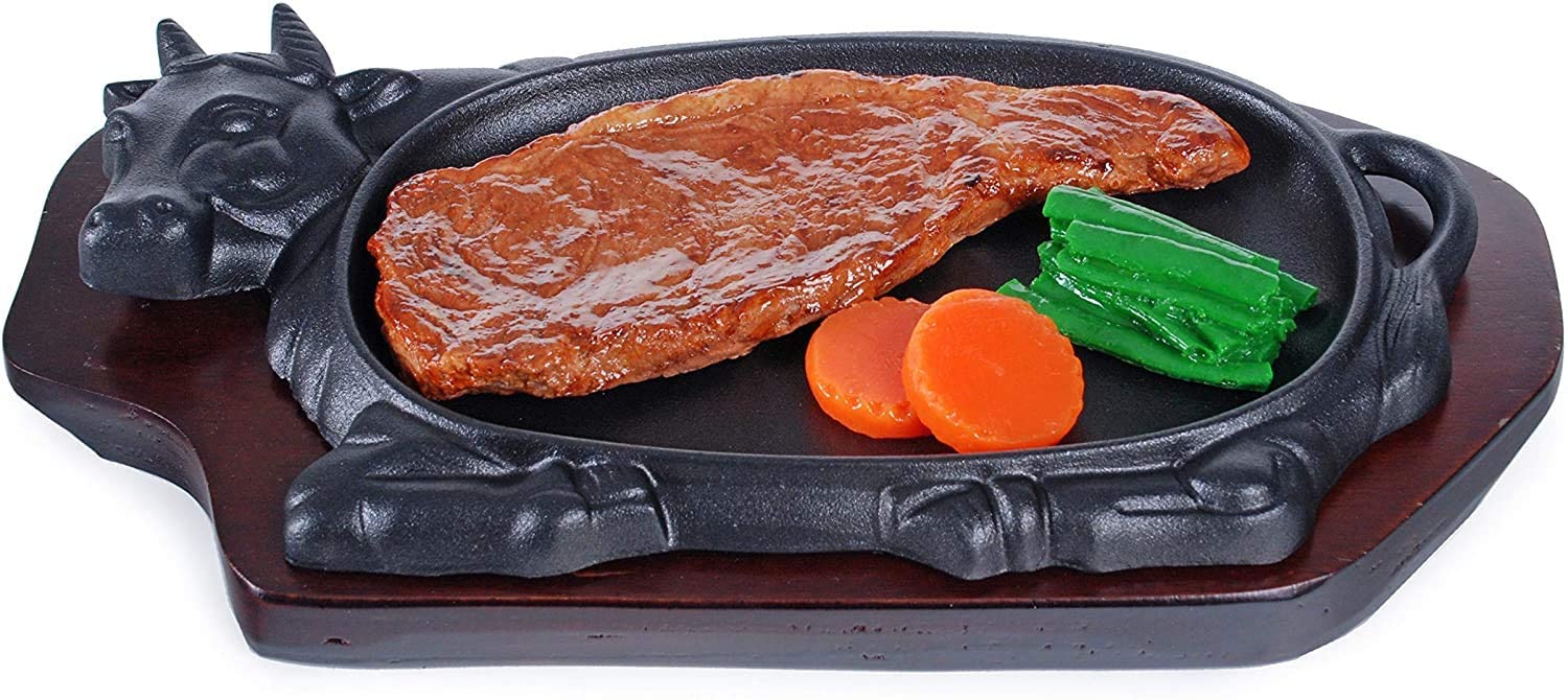 Happy Sales HSGRD-COW12, Large Cast Iron Steak Plate Sizzle Griddle with Wooden Base Steak Pan Grill Fajita Server Plate Household use or Restaurant Supply.Cast Iron with a smooth griddle perfect for grilling sizzling steak, fajita, sizzling noodles. Cast iron is unparalleled in cooking for heat retention and even heating.