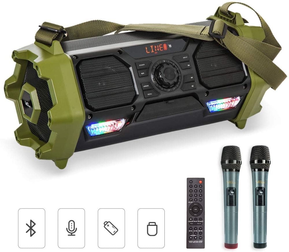 Home » Gadgets » VeGue Karaoke Machine Portable Bluetooth Wireless Speaker Gadgets VeGue Karaoke Machine Portable Bluetooth Wireless Speaker July 7, 2020 82 HD STEREO SOUND QUALITY: With Dual 3” tweeters, Single 6.5” woofer and 360° full range sound design, VS-6633 makes the bass stronger and more balanced and it does not distort the audio even at higher volumes. Super noise reduction and strong anti-interference ability ensure that you get clear and loud sound.POWERFUL LITHIUM BATTERY:Built-in powerful lithium battery for safer and more efficient use. It could provide 6-10 hours non-stop music playing. So you can take it out to your favorite jams anywhere without the restrictive cords! Besides, the USB port can be used as a power bank to recharge your phone/tablet.MULTI-FUNCTIONAL PA SYSTEM: VS-6633 will work as karaoke machine, music player, PA system, guitar amplifier etc. Colorful LED light will flash with the beat of music. Built-in Bluetooth for wireless connection, up to 32 ft range. karaoke function can easily remove vocals from songs, making you feel like a singer with your own voice.PORTABLE & UNIQUE DESGIN : With comfortable strap and only 11 pounds, it is easy to take out. With the sleek yet rugged exterior, it is not only sturdy and shockproof, but also waterproof and dustproof. Unique honeycomb shape design and stylish jungle color make you easily become the focus of the crowd.