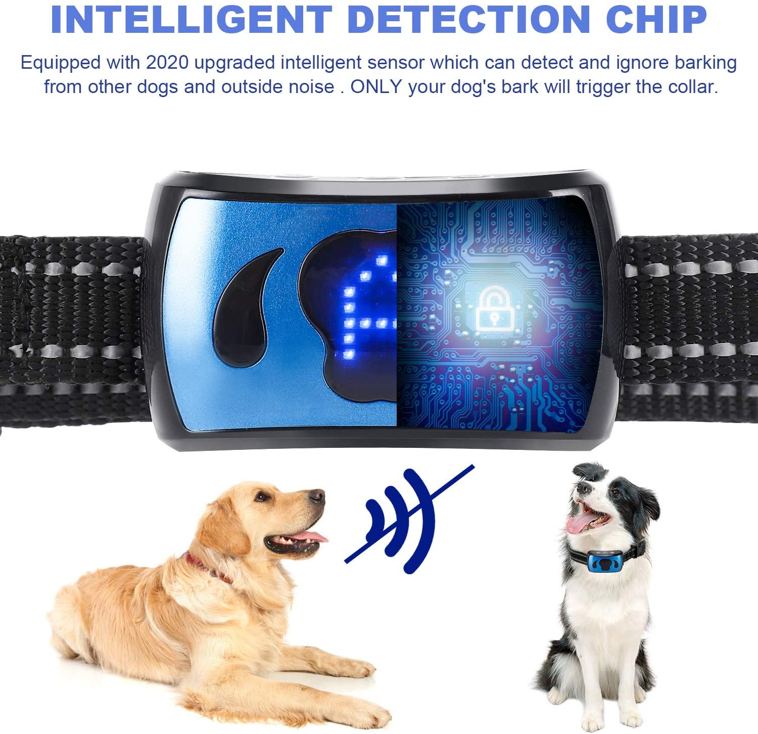 Equipped with INTELLIGENT SENSOR which can detect and ignore barking from other dogs and outside noise . You don’t have to waste your time anymore with this automatic bark collar. It helps your dog learn how to stop barking without your participation. Please make sure the collar is NOT TOO TIGHT, two fingers must fit between the collar belt and your dog’s neck.2 HUMANE TRAINING MODES(SHOCK LEVELS ADJUSTABLE) & 4 SENSITIVITY LEVELS ADJUSTABLE – Our bark collar has 2 training Modes: Beep + Vibration, Beep+Vibration+Shock. And 1 to 4 adjustable sensitivity level adjustable. SHOCK MODE LEVELS FROM NONE TO STRONG, a total of 4 CHOICES( UPGRADED DESIGN TO PROTECT YOUR PET ). Choose the most suitable mode for barking without harmness to your pet, and set the mode and level freely as your needs.