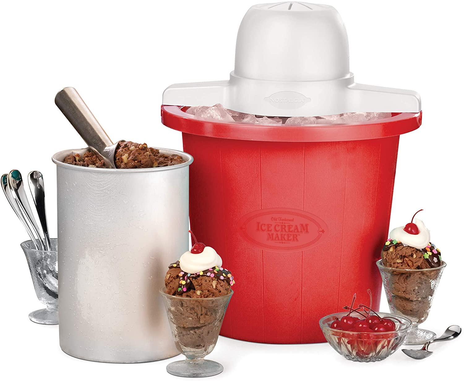 The fast and easy way to make 4-quarts of ice cream, frozen yogurt, or gelato. This unit features a locking motor mount, easy-to-clean plastic bucket and 4-quart aluminum canister. Simply add your ingredients into the aluminum canister, place in the middle of the bucket, layer with ice and salt, and let the electric motor do the rest.